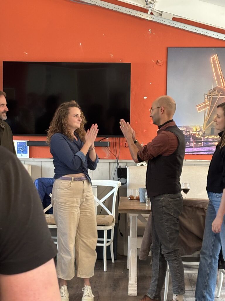 Wendy en Lennart van theatersportgroep Sterk Spul ‘warmden ons op’ met een oefening om vrij te spelen.